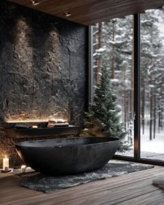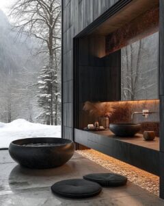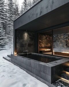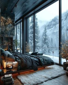 The exterior is defined by bold, dark framing and expansive floor-to-ceiling glass walls. These transparent panels dissolve the boundary between indoors and outdoors, allowing the snowy scenery to become a living mural. Bare winter trees stretch into the misty sky, while soft layers of snow blanket the ground, creating a calm and almost cinematic atmosphere.