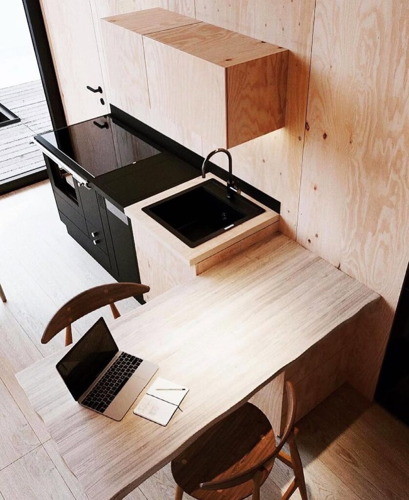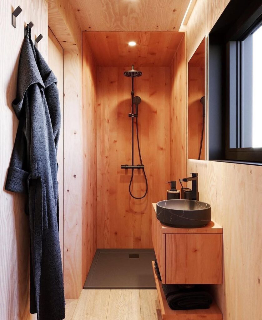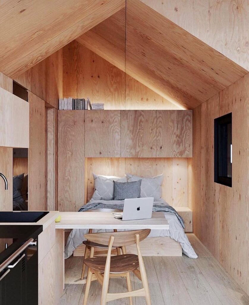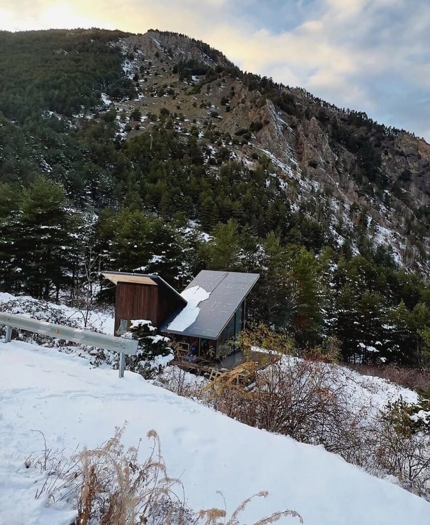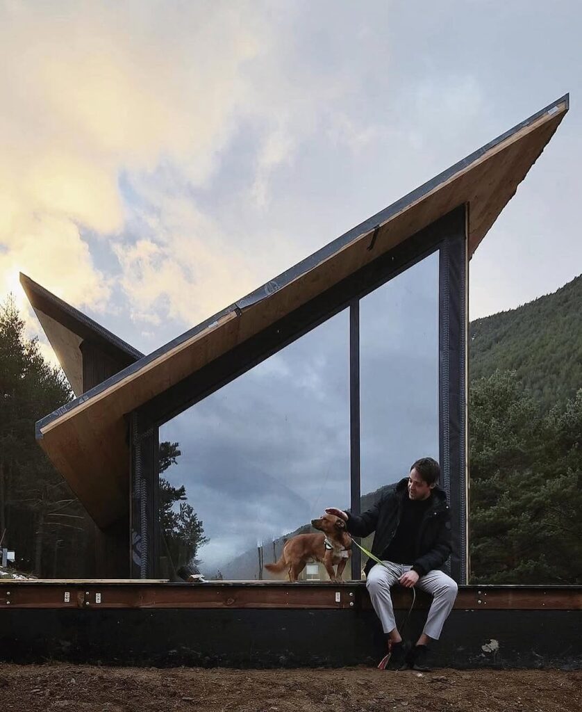 The cabin’s sharp outer edges contrast beautifully with its gentle environment. The wood exterior, weathered and textured, echoes the colors of the mountain terrain, allowing the structure to harmonize with nature despite its modern form. This thoughtful interplay between harsh geometry and organic scenery gives the cabin a character that feels both bold and respectful of its setting.