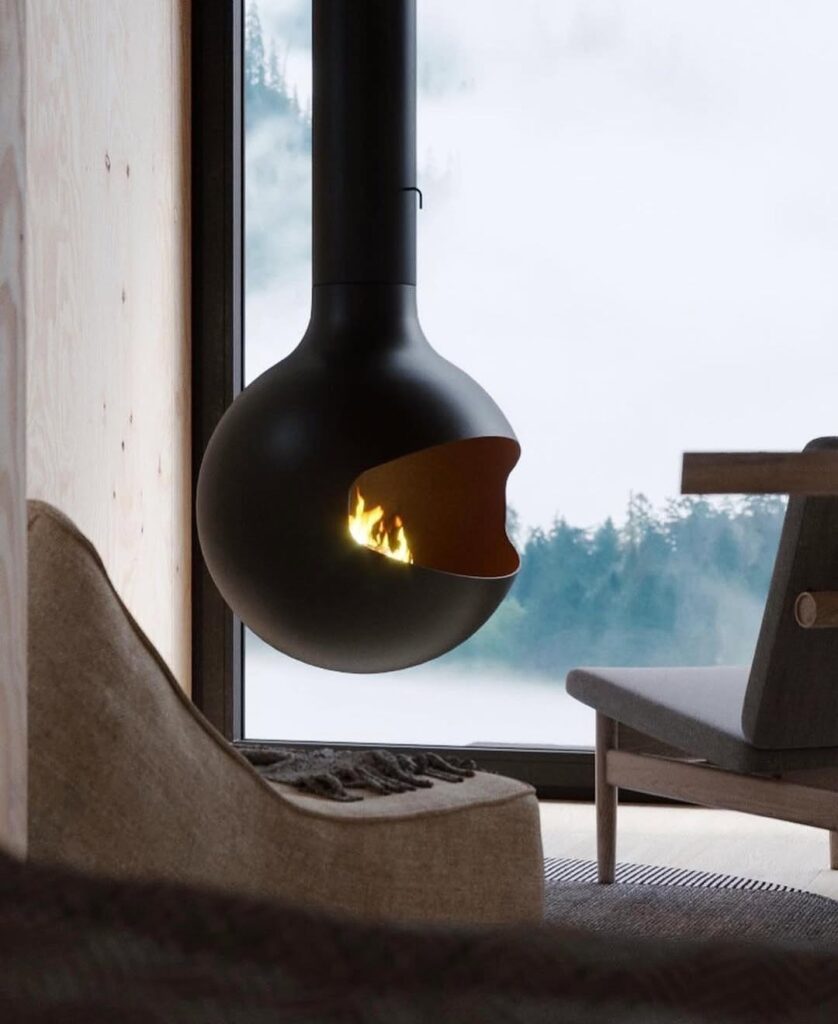 Inside, the refined simplicity of the interior creates an atmosphere of calm. Clean lines, natural textures, and subtle lighting come together to form a serene retreat ideal for reflection or quiet escape. Every element appears purposeful, from the suspended fireplace chimney to the soft drapery that hints at movement even in stillness.