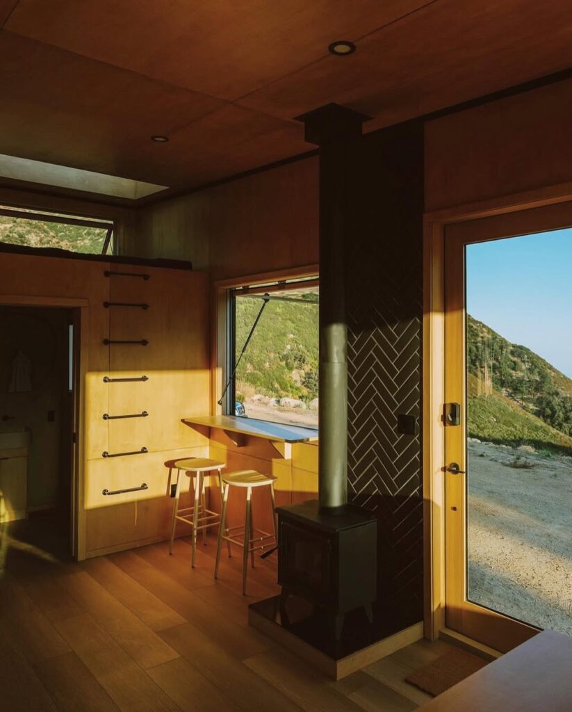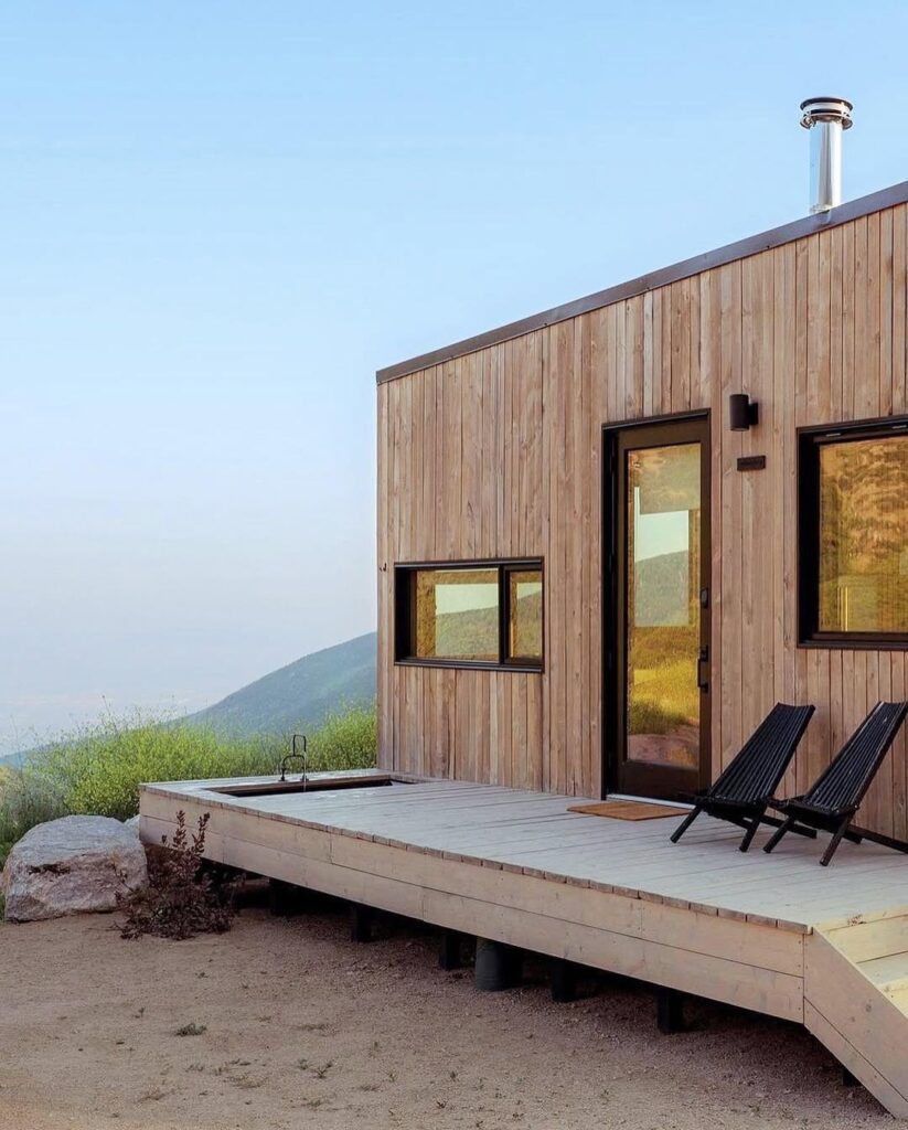 The cabin’s exterior is clad in warm natural wood, giving it a cozy yet contemporary charm. Large windows bring in plenty of natural light and frame sweeping views of the hills beyond. From the moment you see it, the home feels like a place where time slows down.