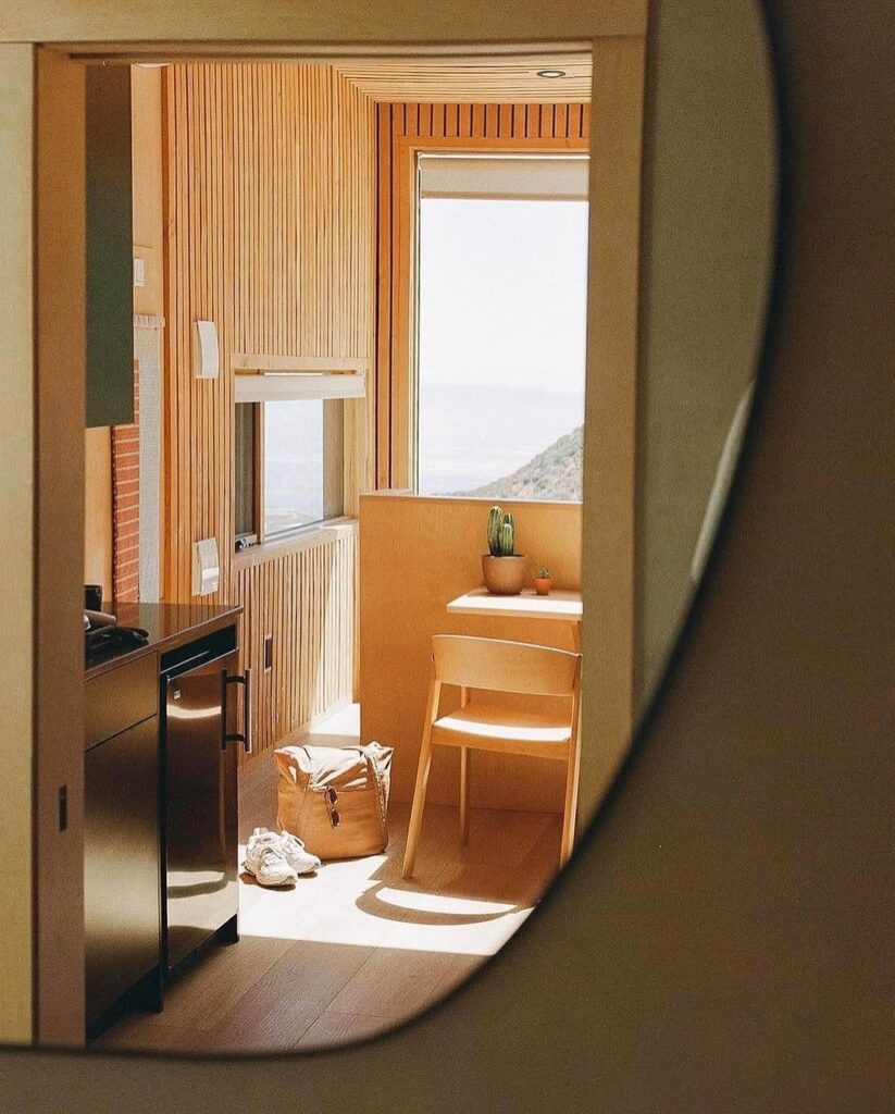 The muted tones of the cloudy sky above give the scene a soft, calming atmosphere. Paired with the earthy textures of the hillside and the clean geometry of the cabin, the setting feels intentionally crafted for rest, reflection, and quiet living.